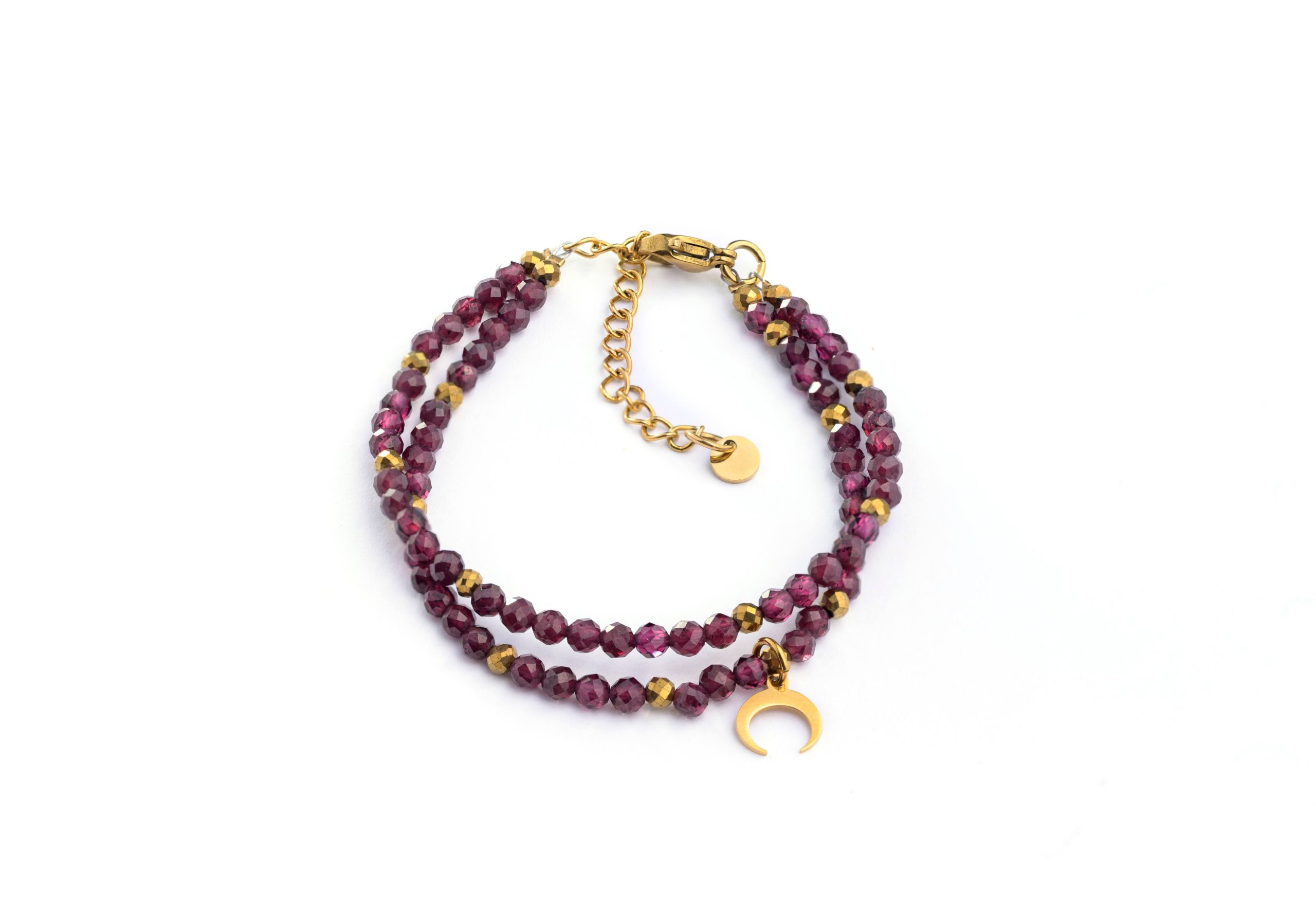 Subtelna podwójna bransoletka z delikatnych kamieni Granatu i pięknie mieniącą się zawieszką księżyca.