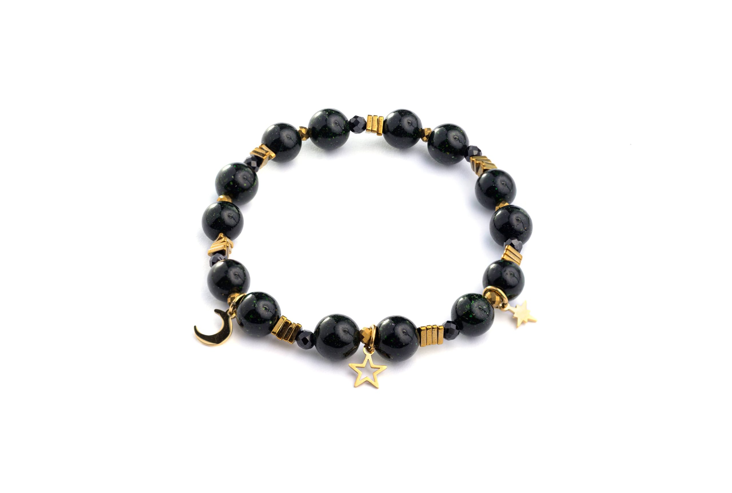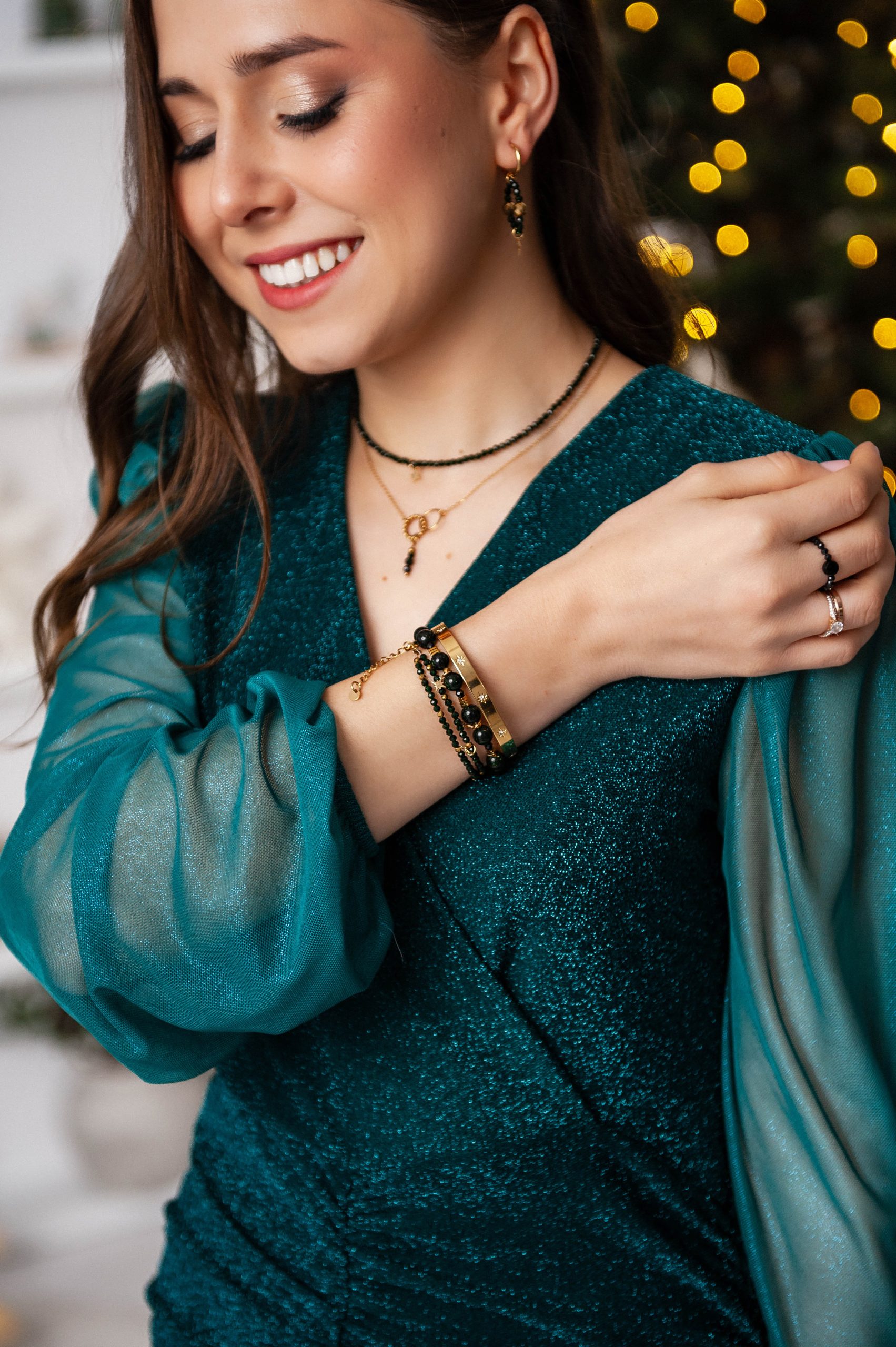 Ta bransoletka została stworzona specjalnie z myślą o świętach. Odnajdziesz w niej trzy zawieszki : księżyc i gwiazdki, które sprawiają , że staje sie ona jeszcze bardziej klimatyczna.  Idealnie pasuje do zielonej sukienki lub czarnej i białej koszuli.