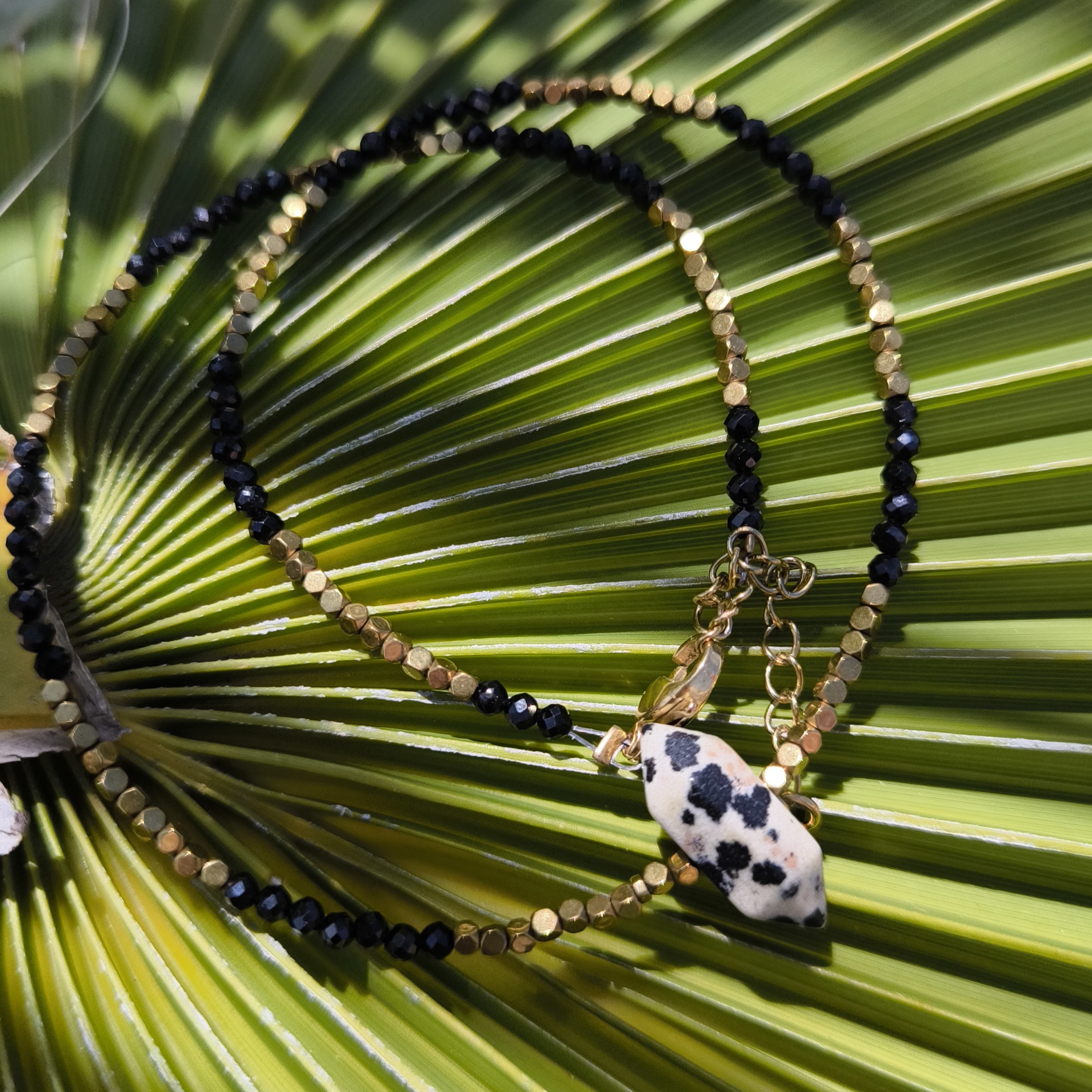 W centralnym punkcie znajduje się bryła w kształcie grotu z jaspisu dalmatyńskiego – kamienia zdrowia, ochrony, odwagi i równowagi, o charakterystycznym nakrapianym wzorze. Ten mocny detal dodaje naszyjnikowi nie tylko wyrazistości, ale i unikalnego charakteru.