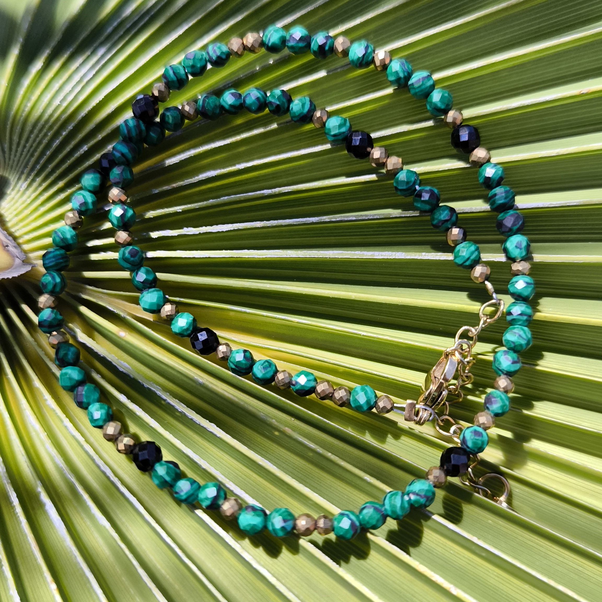 Całość uzupełniają złote kuleczki hematytu, które dodają elegancji oraz czarny spinel, znany ze swojego subtelnego blasku i ochronnej energii.