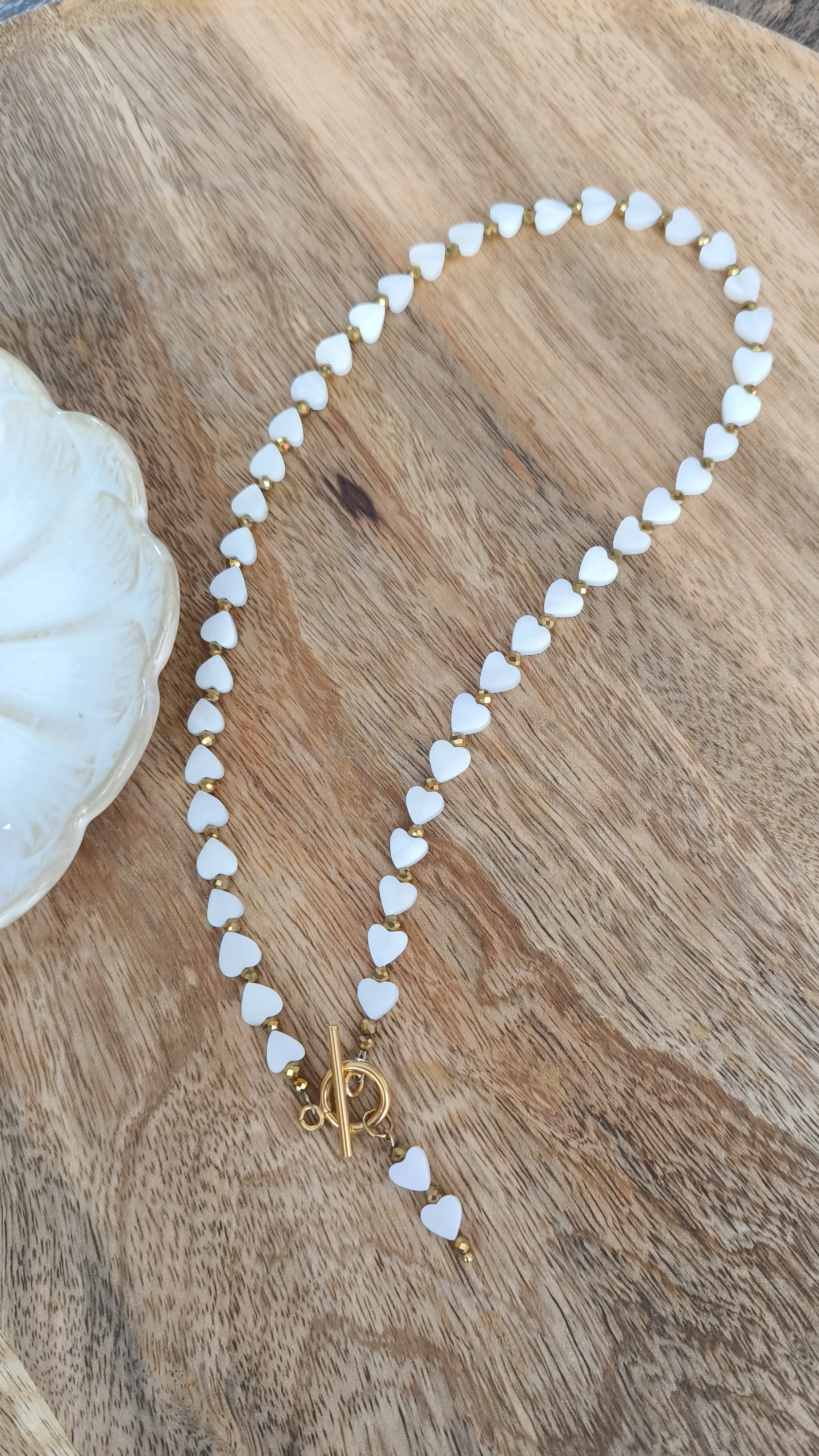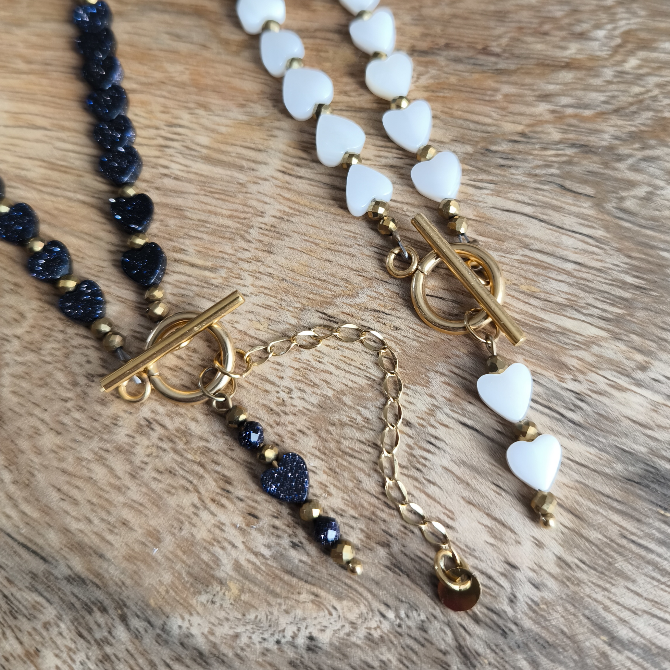 Naszyjnik uzupełniają złote kamienie hematytu, które wnoszą akcent luksusu i harmonii. Zapięcie typu Toggle z piękną zawieszką w kształcie serduszek podkreśla unikalny design i wygodę użytkowania, a jednocześnie dodaje całości uroku.