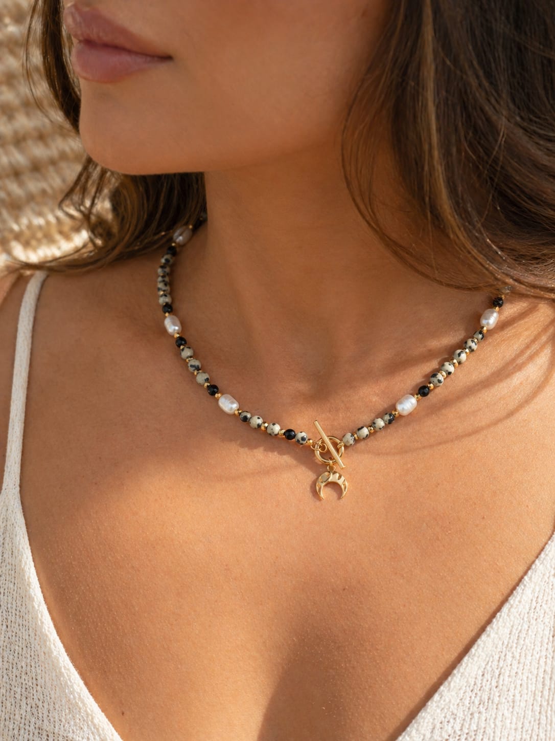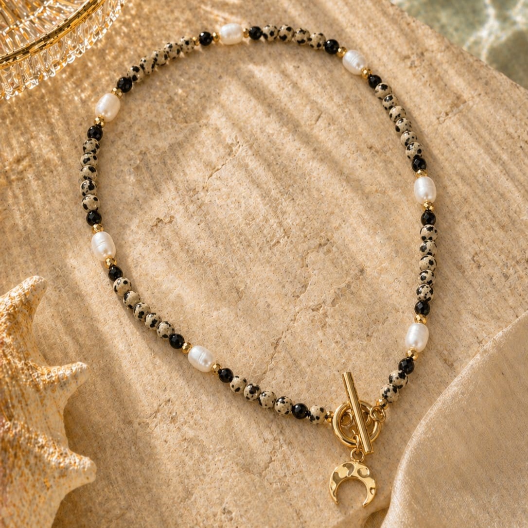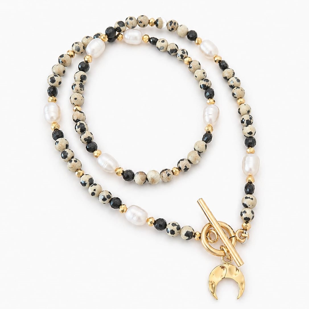 Ręcznie wykonany naszyjnik, którego bazą jest naturalny jaspis dalmatyński – kamień o unikalnym, nakrapianym wzorze, symbolizujący ochronę, równowagę i siłę wewnętrzną.